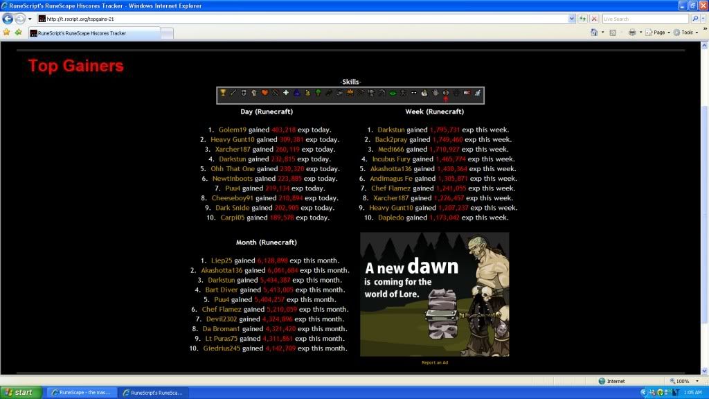 http://runetracker.org/track-Ngor46 DragonBro002: Thanks for posting this here. You know how I barely have time to chat in game, because I am always working on every skill to 99. Well, I am glad you posted this, so I can review it in my free time, right before bed and passing out, or going to work in the morning. At any rate, it is a great website, and should prove useful if we ever host a contest for whom can earn the most experience in various skills through 24 hours, or even 7 days.I love this website. Plus, so far so good, it seems safe. Golem19: You were rank 1 that day in runecraft experience. And did you notice whom was #6? That is the guy that owns a 99 everything Player Moderator that visited our town named NewtinBoots, whom owns a level 3 he is working on now named FrogsInClogs. Good memories. Just funny the people we never notice around us, that we later meet up with and are sheer ownage, just like ourselves. ![]() By the way, I hope you get back your 2nd fisher 99, so I have more motivation to earn my 3rd fisher 99. Viva el Golem19!War Fl4g: I can't earn nearly as much as the world 9 master, Samboza. Yet I have the time devotion to no life for more hours per year, resulting in the same experience (well... not really). But I just found out, when I mine Gold Ore using the SC Pickaxe over at the Craft Guild, it takes me 6 hours to earn 100000 experience (which is a day for me, on average). And he earned 400k+ in a single day. I believe Zezima best look out, the next N0valyfe is in town. Perhaps the reincarnation of The Old Nite and Fat Wrecked, combined into a single person.
