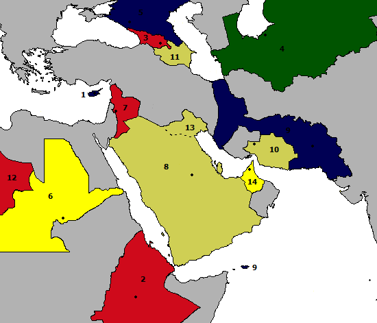 I have decided (on a lazy, dull day) to edit the map of the Middle East. I have investigated all nations that are active and those that are not and have come to a conclusion of what the current climate of the Middle East looks like, All Grey areas signify the presence of unofficial nations and can be claimed although they are currently home to bedouin tribes. Posted Image Brackets = Previous Nation Number - (3) - 1 - Cyprus, Nicosia - (4) - 2 - Morrocon, Addis Abba - (6) - 3 - The Divided Nations of Georgia Principality of Kartli-Amazi, Sultanate of Kolchis-Lazistan, Independent City of Tlibisi - (7) - 4 - Nag Ehgoeg, Syntha Prime - (10) - 5 - Kiensland, Rkayllkisford - (11) - 6 - The Land of New Harumf, New Zion - (14) - 7 - Sedulion, Damascus - (15) - 8 - Paradise, Riyadh - (18) - 9 - Scythirus, Jihamed - (20) - 10 - Royal City of Alexanderhaven, Alexanderhaven - (21) - 11 - The Ottoman Empire, Erzurum - (22) - 12 - Sutekh-Te-Ankh, Ankhwugaht - (34) - 13 - Al-Qalaa [Paradise], Al-Qalaa City - (36) - 14 - Sultanate of Al Fahdi, Ras Al Khaimah I did not record the nations names for ones that do not exist or no longer in our region but these are the numbers, refer to previous map (Page 4) to find the nations; 2, 5, 8, 9, 12, 13, 16, 17, 23, 24, 25, 26, 27, 28, 29, 30, 31, 32, 33, 35 |